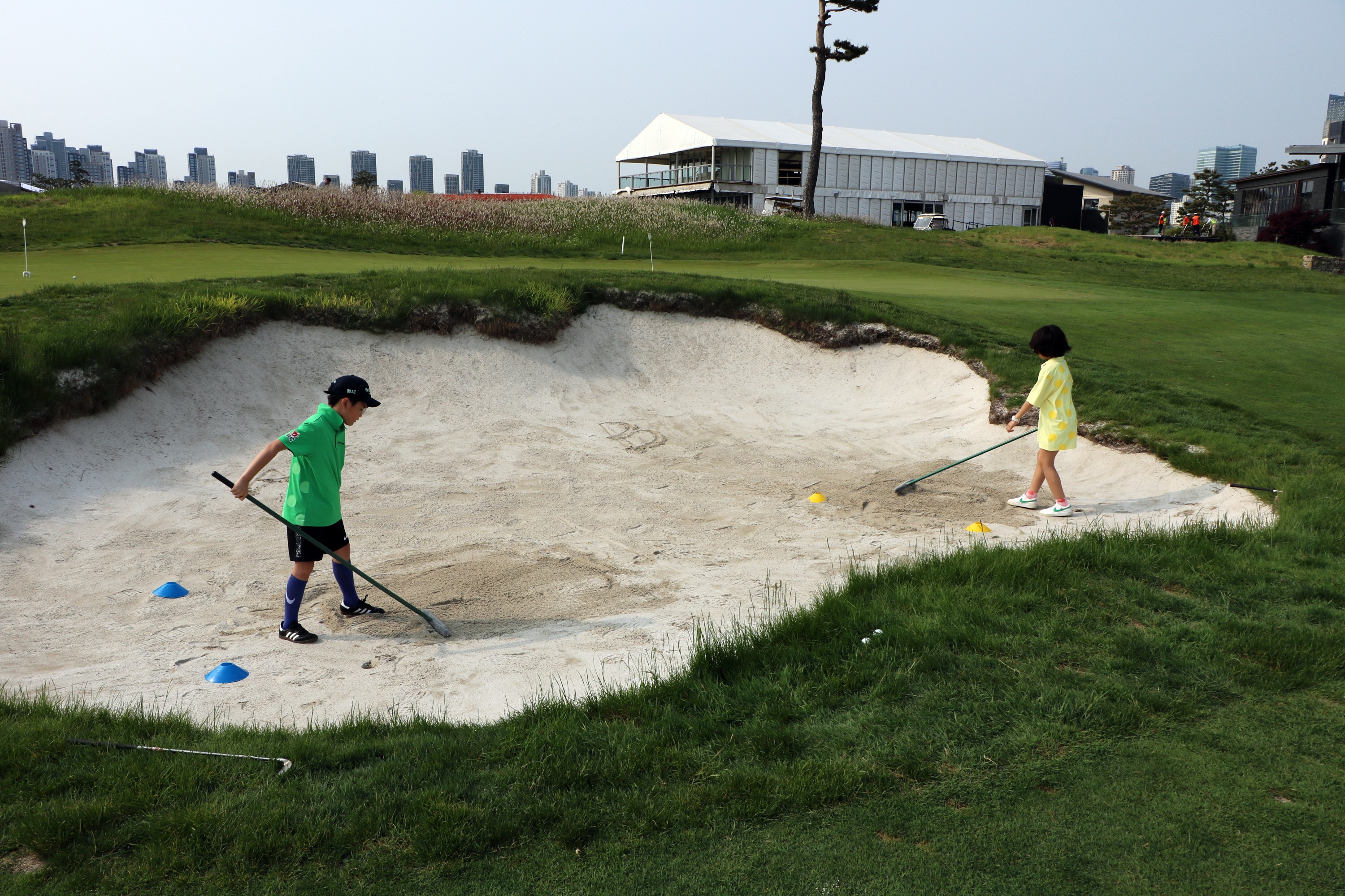 다음 친구를 위해 벙커샷을 실습한 뒤 자신이 연습한 자리를 정리하고 있는 모습