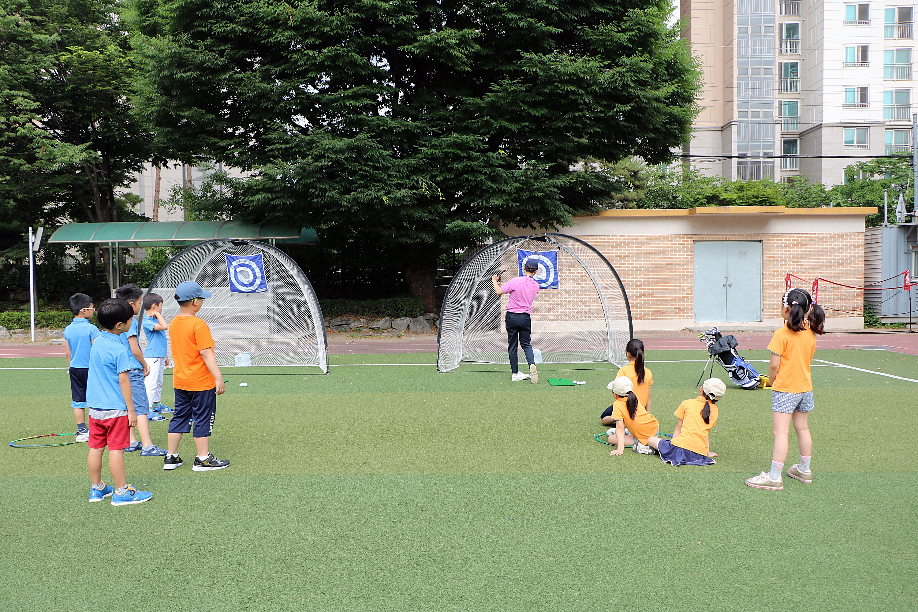 실전 연습에 앞서 코치님의 피치샷 시범을 보고 있는 아이들