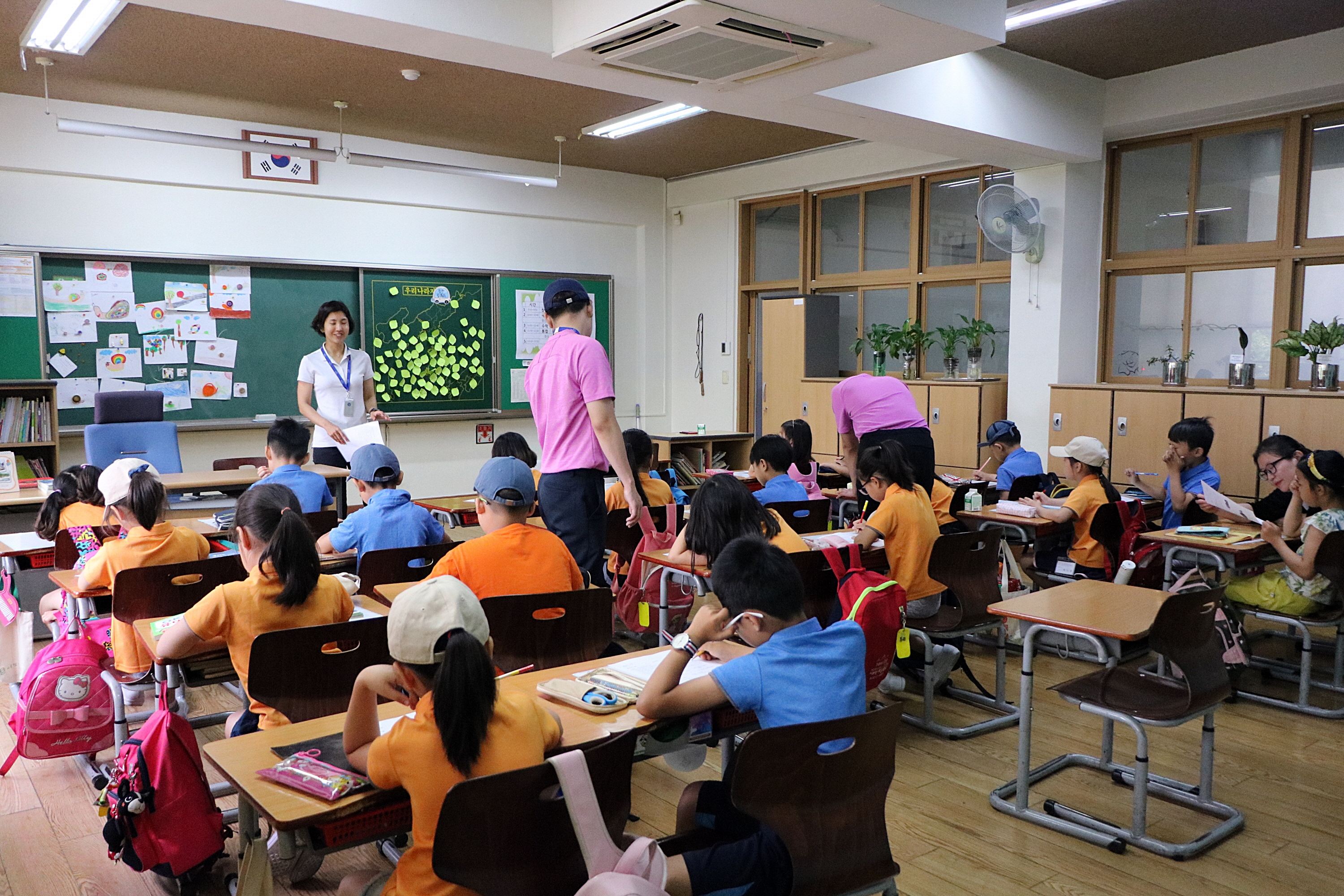 코치님들과 종합평가 문제를 함께 풀어보고 있는 아이들