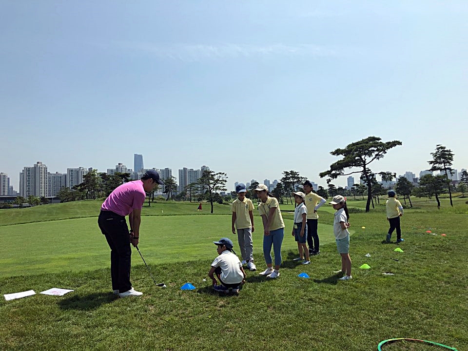 아이들에게 Y TO Y 스윙 시범을 보여주고 있는 코치