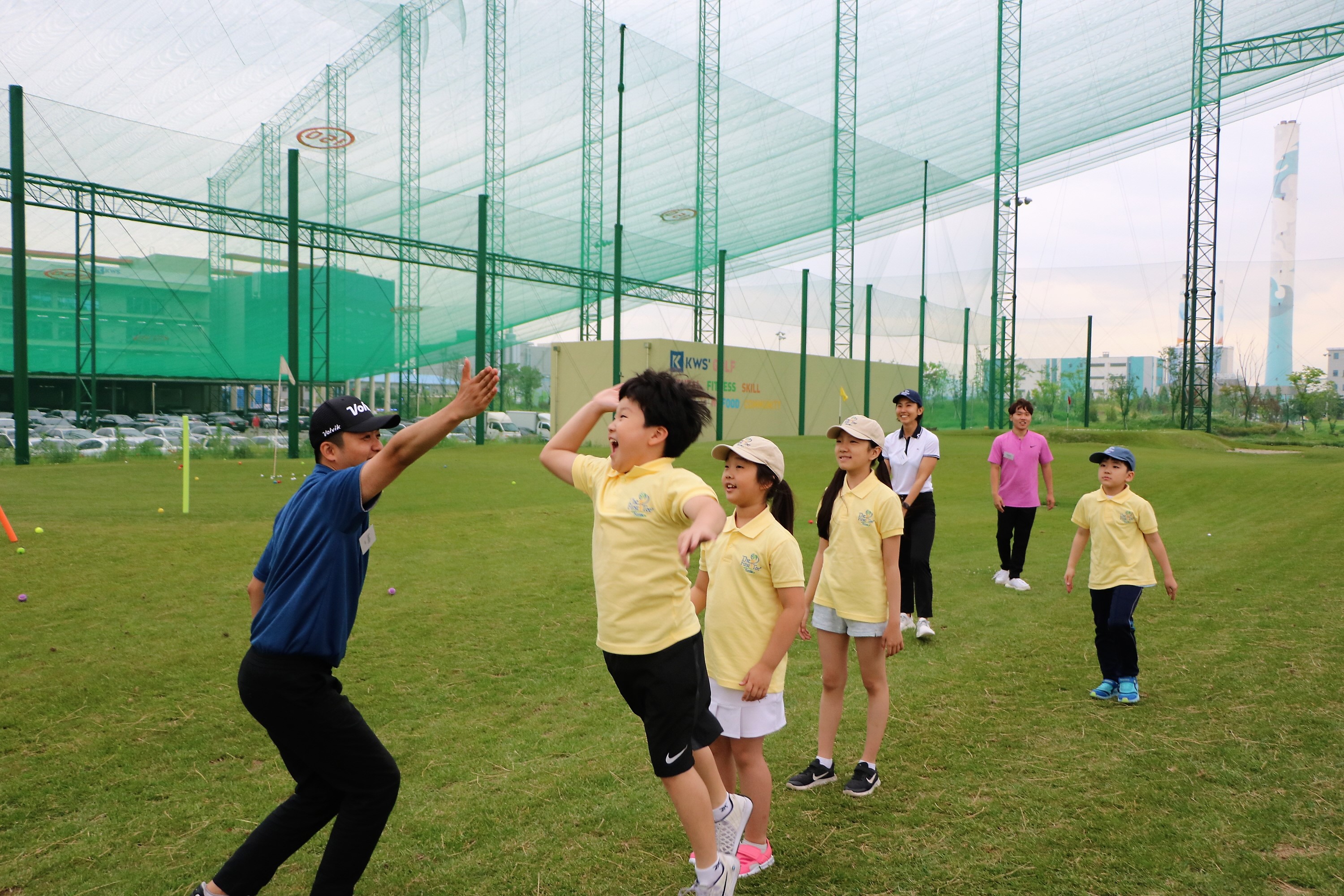 코치님과 활짝 웃으며 마무리 인사로 하이파이브를 하고 있는 아이들