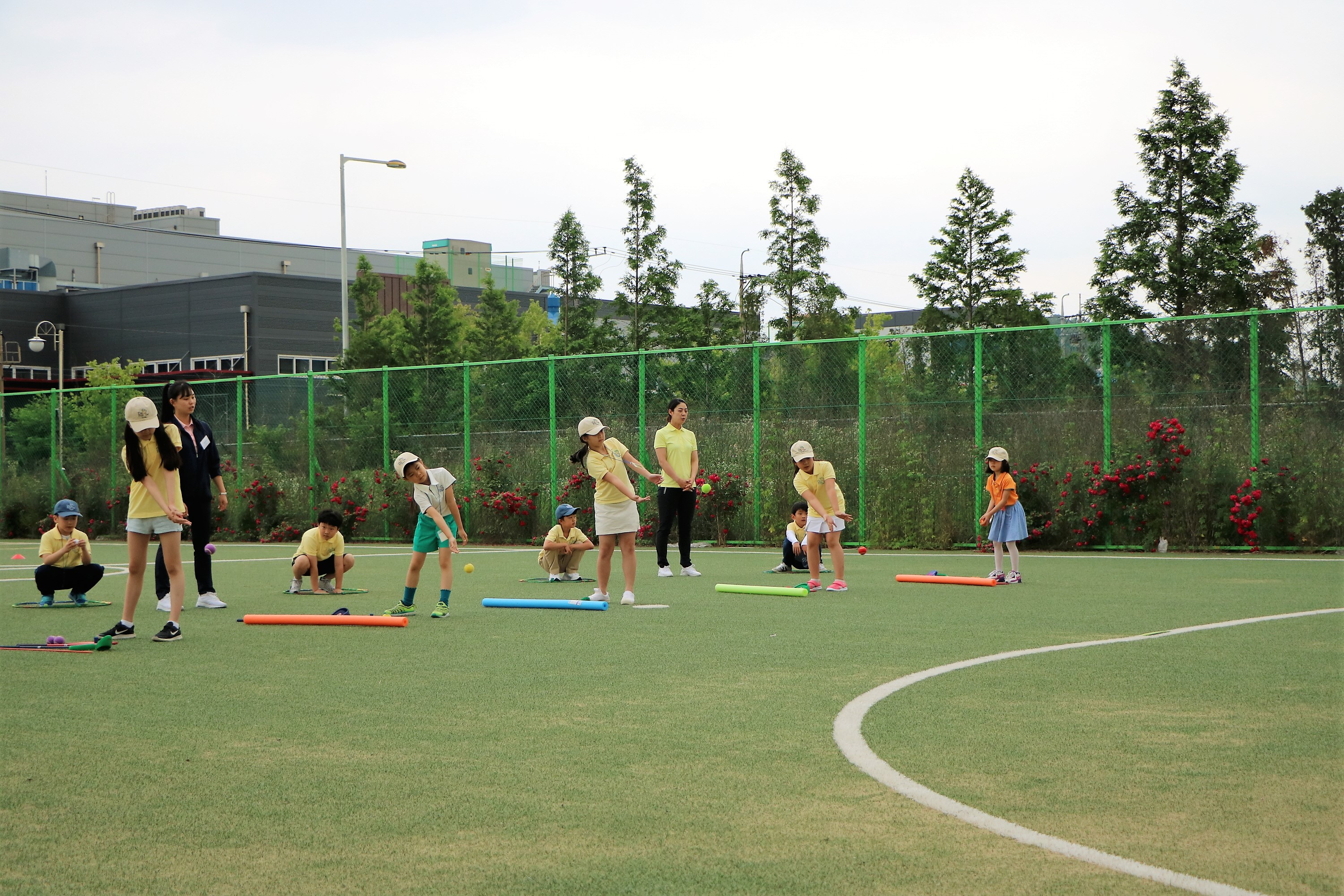 맨손으로 스윙동작으로 하며 공을 던져서 스윙크기에 따른 거리감을 배우고 있는 아이들