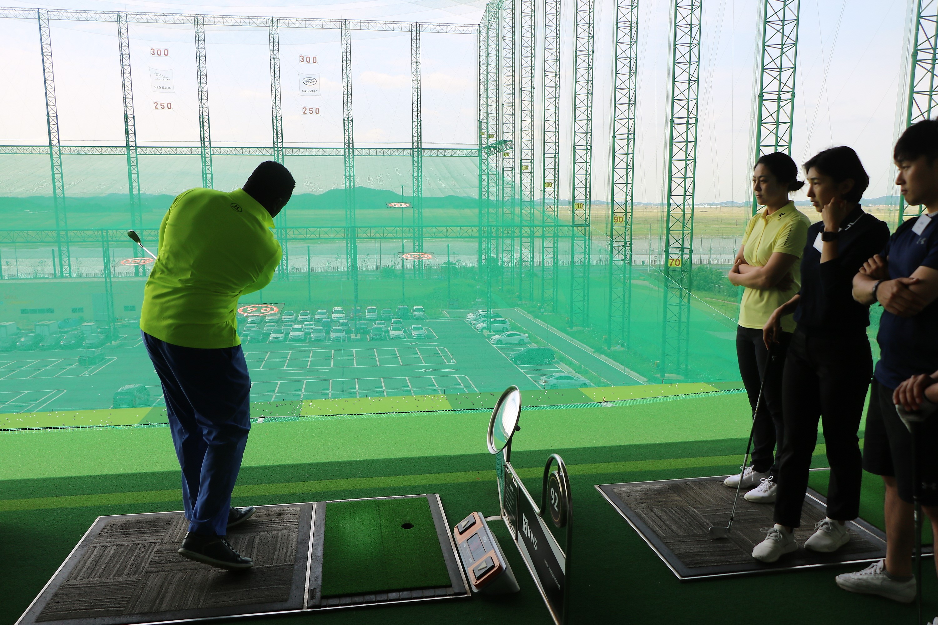 한국 코치교육생들에게 스윙시범을 보여주고 있는 미국 마스터 코치