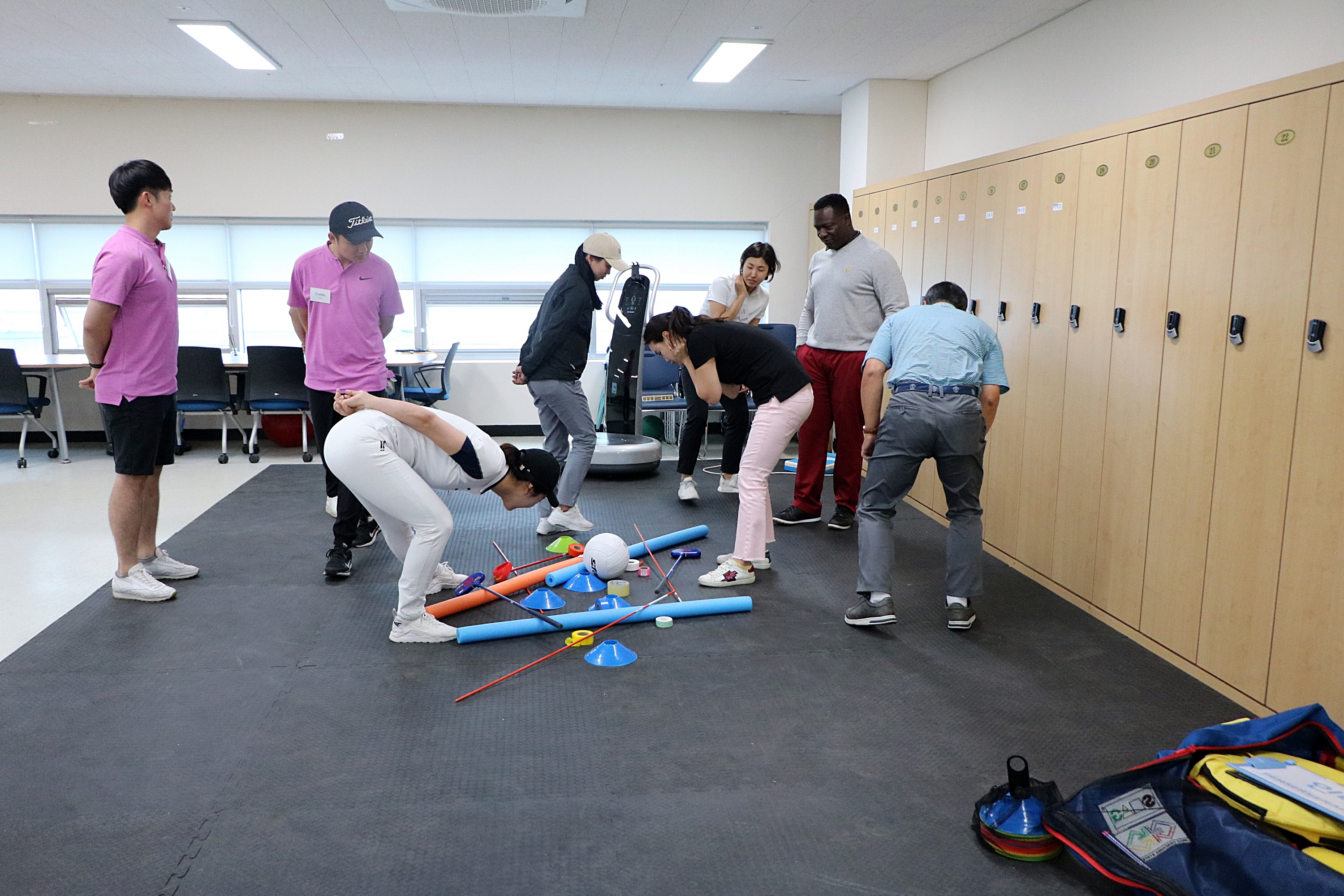 숨긴 펜 찾기 게임을 하며 주의력을 향상시키고 있는 코치들
