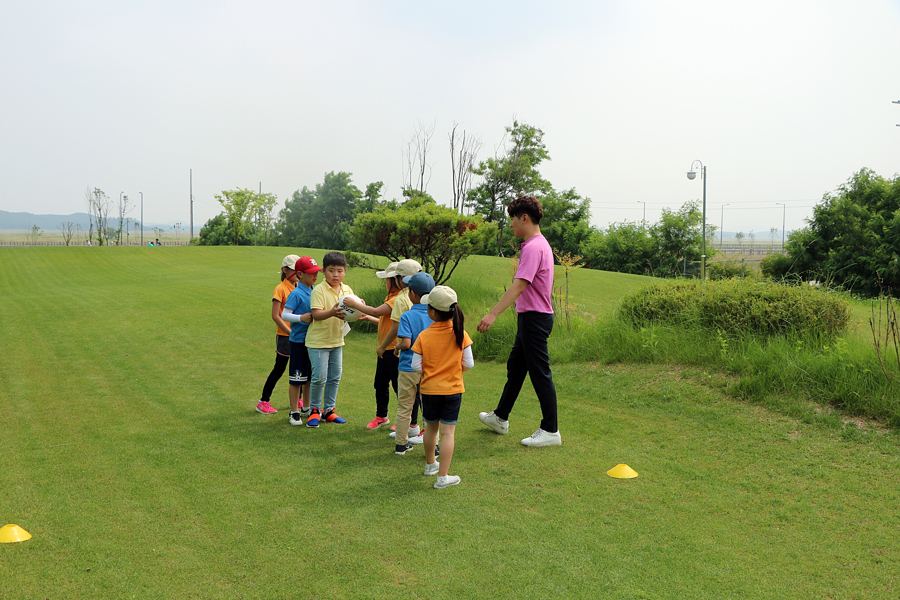 팀워크를 기르기 위해 뒷사람에게 공전달하기 게임을 하고 있는 아이들