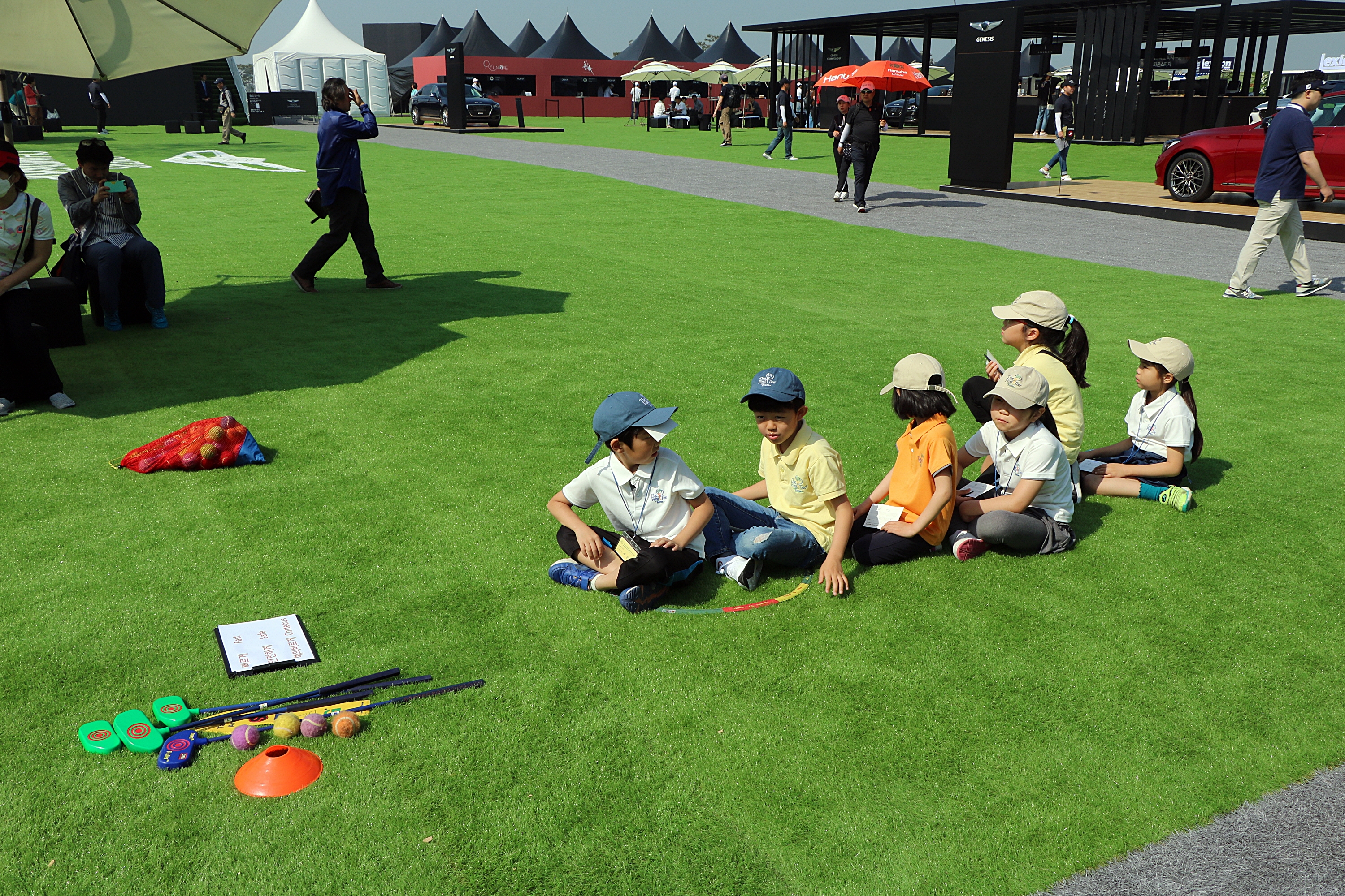 티샷하기 전에 안전구역에서 질서정연하게 자기 차례를 기다리고 있는 아이들
