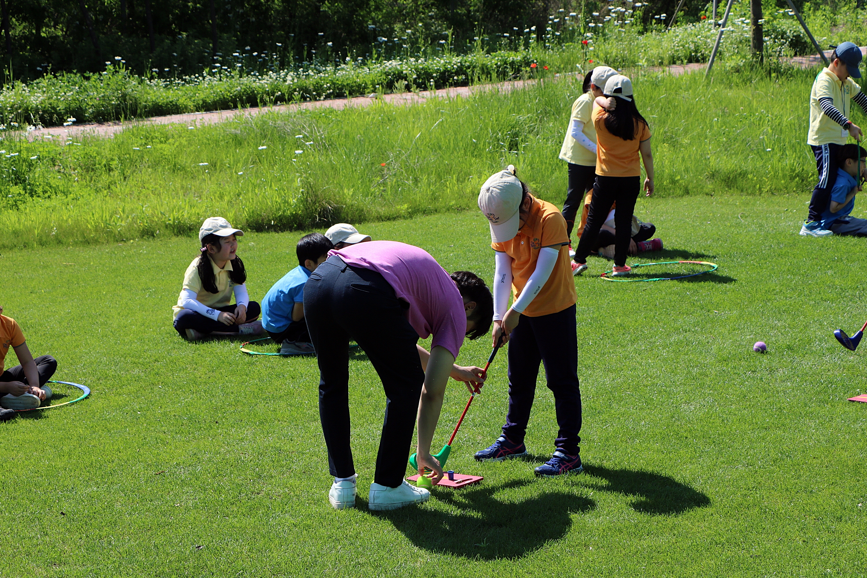 스윙의 기본인 어드레스 자세를 1:1로 배우고 있는 아이들