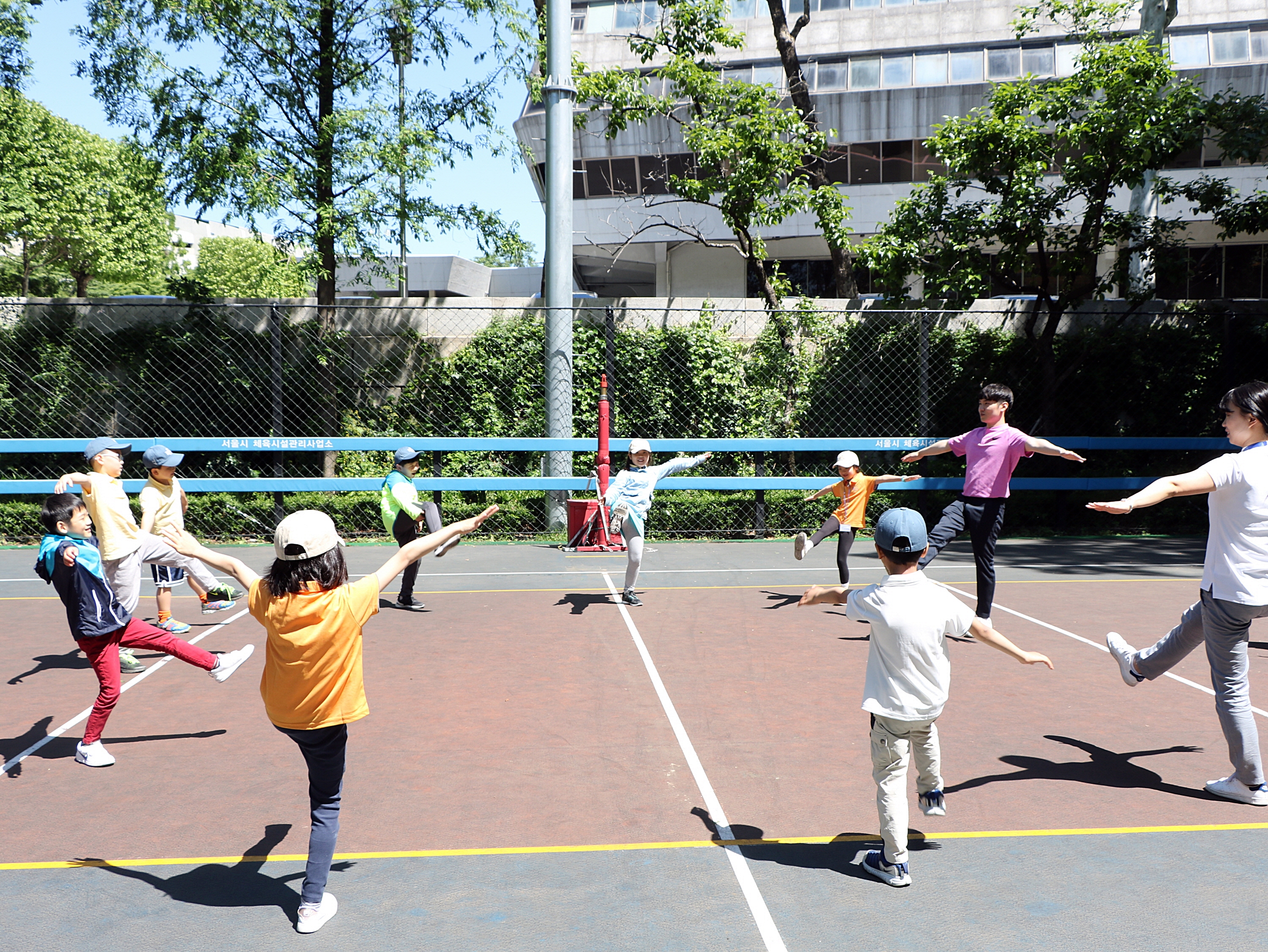 양팔을 벌린 뒤 한발 들고 서서 균형감각을 기르고 있는 아이들