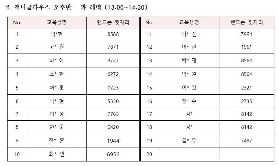 2020 더 퍼스트 티 코리아 상반기 정기교육에 많은 관심과 애정을 보내주신 학부모님과 자녀 여러분께 감사드립니다. 예정대로 이번 상반기 정기교육에 참여할 교육생 명단을 아래와 같이 공지하오니 참고하시기 바랍니다. 혹시 이번 상반기 교육에 아쉽게 탈락된 분들도 그냥 포기하지 마시고, 하반기 정기교육에 다시 신청하셔서 꼭 교육 참여 기회를 한번 더 가져보시기 바랍니다.