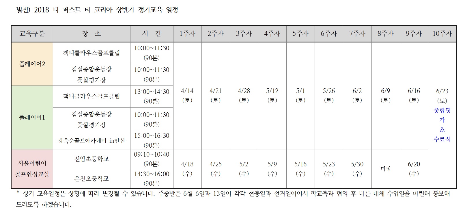 당 재단이 주최, 주관하고 서울시가 후원하는 2018 더 퍼스트 티 코리아 상반기 정기교육에 참여해 주신 학부모님들과 교육생 여러분을 진심으로 환영합니다. 아래와 같이 총 10주간의 교육이 진행되오니 참조해 주시기 바랍니다.