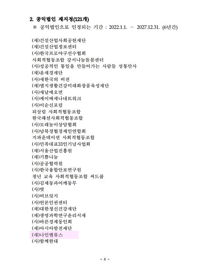 법인세법 시행령 제39조 제1항 제1호 바목 및 같은 조 제14항에 의해 당 재단이 공익법인으로 재선정되었습니다.
